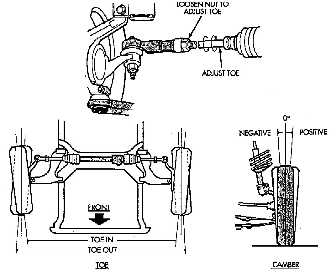 4. Toe is measured in degrees or inches and is the distance that the front edges of the tires are closer (or farther apart) than the rear edges.