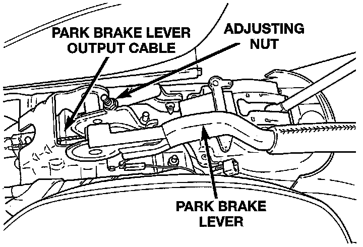 NOTE: Actuating the park brake lever to its fully applied position 1 time after tightening the adjustment nut will yield (stretch) the bent nail portion of the tension equalizer approximately 1/4 inch. This process will correctly set the park brake cable tension.