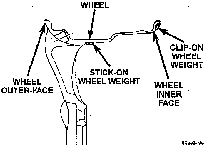 For static imbalance, find the location of the heavy spot causing the imbalance. Counter balance the wheel and tire directly opposite the heavy spot. Determine weight required to counterbalance the area of imbalance. Place half of this weight on the inner rim flange and the other half on the rim between the outer face and the weld using tape on wheel weights. Off-vehicle balancing is necessary.