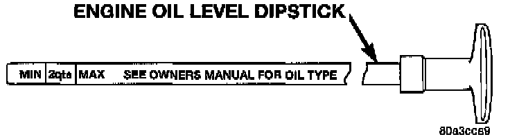 Checking the oil while the vehicle is on level ground will improve the accuracy of the oil level reading. The dipstick is calibrated for 2 quarts between Min and Max marks.