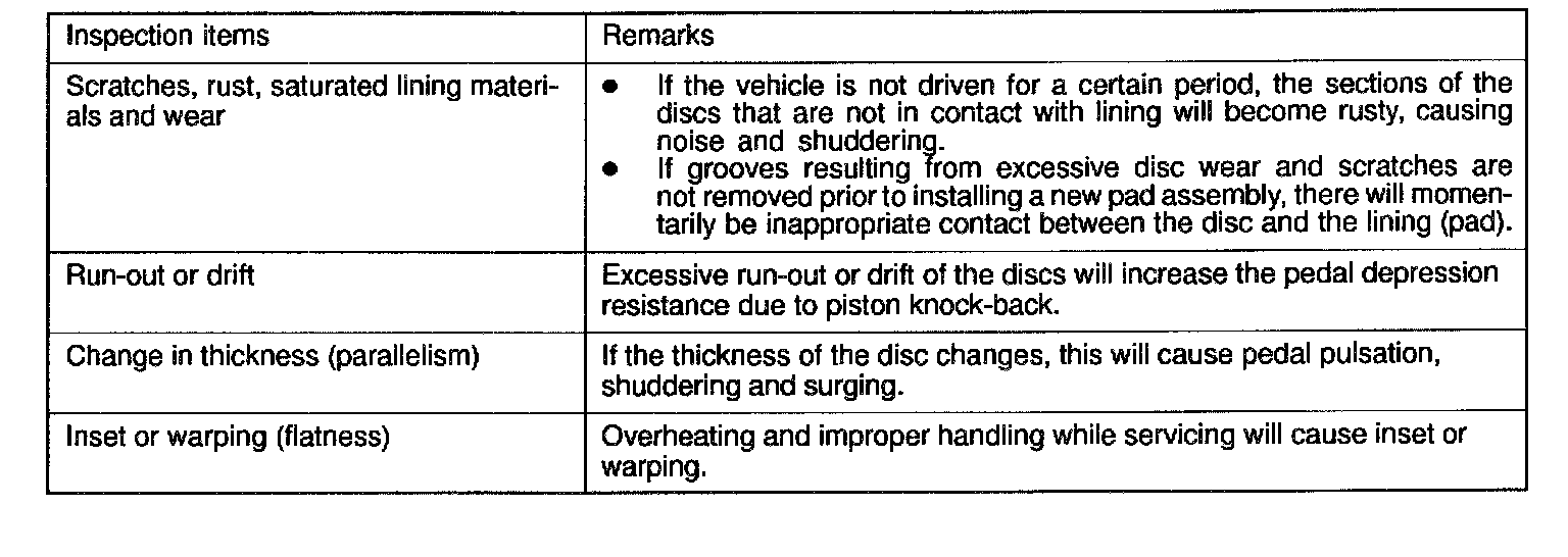CAUTION: To maintain safe braking performance, the disc brake rotors must be kept within allowable service specifications.Before re-finishing or re-processing the brake disc surface, the following conditions should be checked.