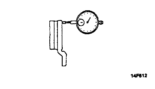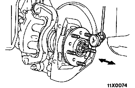 2. Remove the brake disc, and then place a dial gauge as shown; then move the hub in the axial direction and measure the play.