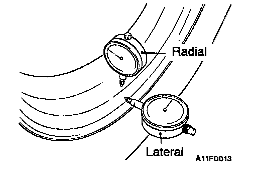 Jack up the vehicle so that the wheels are clear of the floor. While slowly turning the wheel, measure wheel runout with a dial indicator.