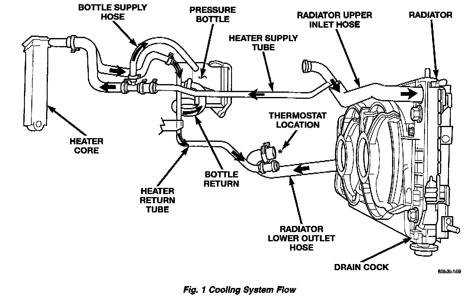 ^ When Engine is warm: Thermostat is open, coolant flows through the radiator, heater core, coolant bottle and by-pass (no by-pass 2.7L).