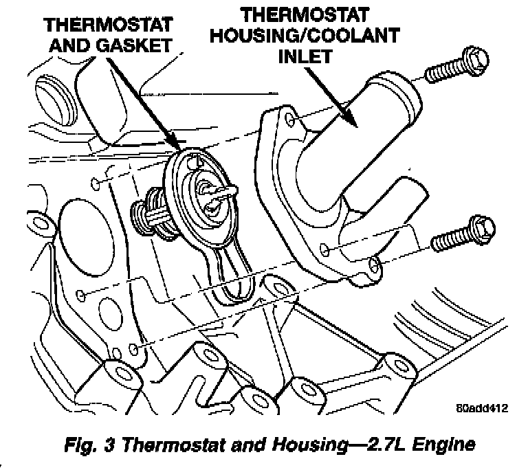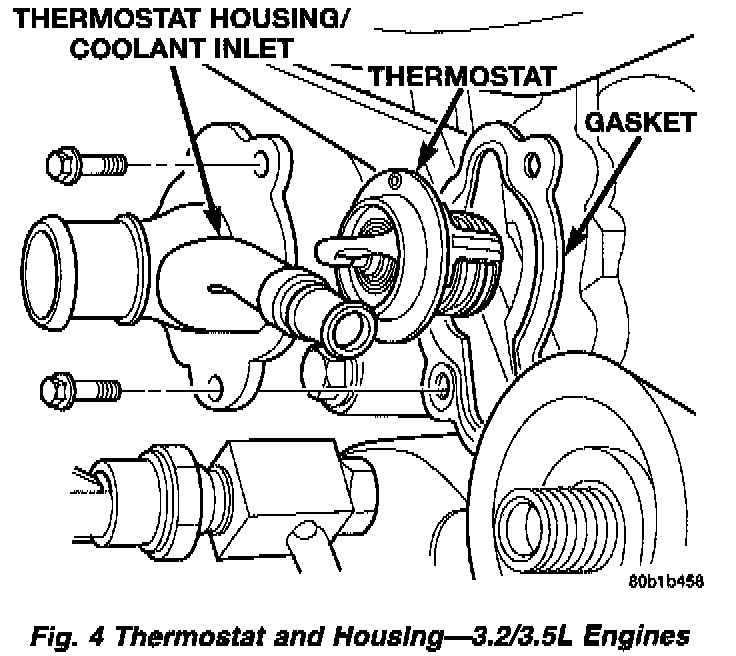 The thermostat on the 2.7L and 3.2/3.5L engines are located on the lower left side of engine, near the front. The thermostat on both engines are on the inlet side of the water pump. The thermostats have an air bleed located in the thermostat flange.