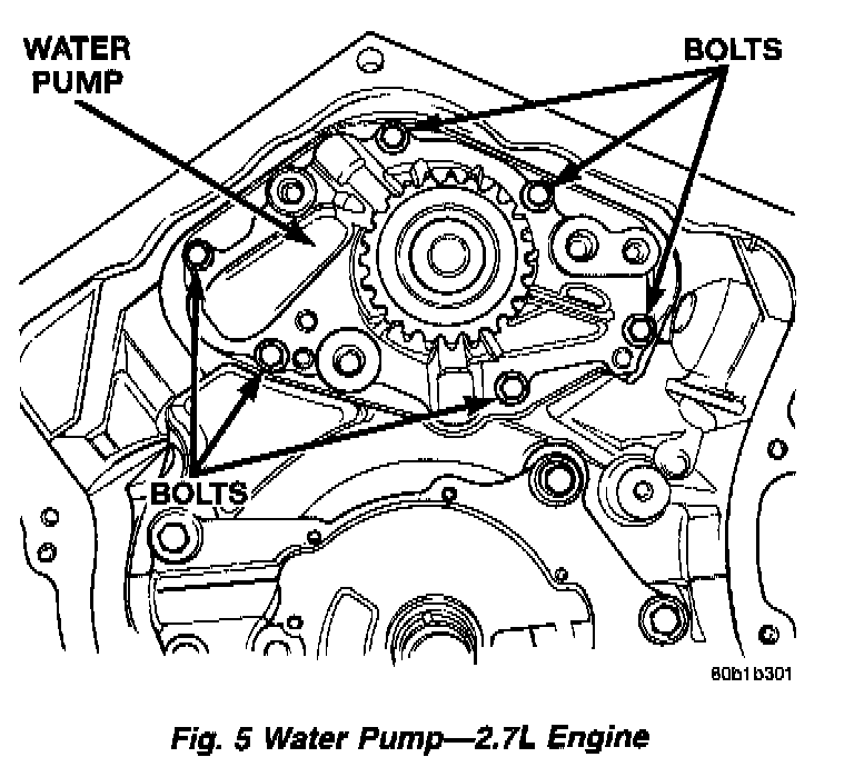 The 2.7L pump has a die cast aluminum body and a plastic swept vane impeller. It bolts directly to the cylinder block, behind the timing chain cover. The water pump is driven by the back side of the engine primary timing chain.