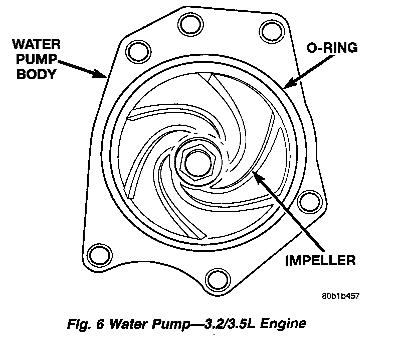 The 3.2/3.5L water pump has a plastic swept vane impeller. The housing bolts directly to the right rear timing belt cover, using an O-ring gasket for pump to cover sealing. The pump is driven by the engine timing belt.