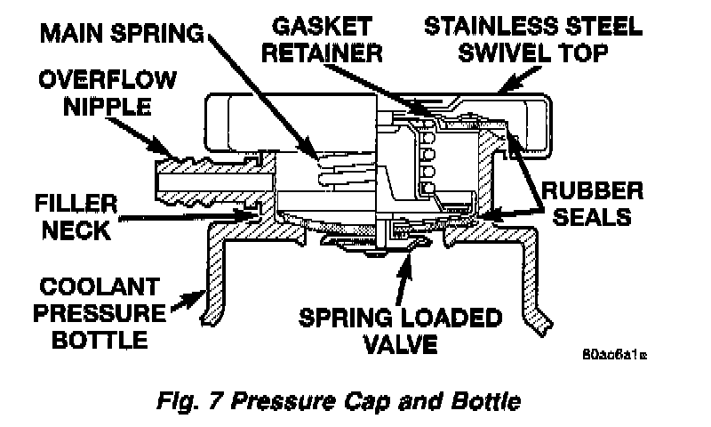 The Coolant bottle is equipped with a pressure cap which releases pressure at some point within a range of 110 kPa ±14 kPa (16 psi ±2 psi).