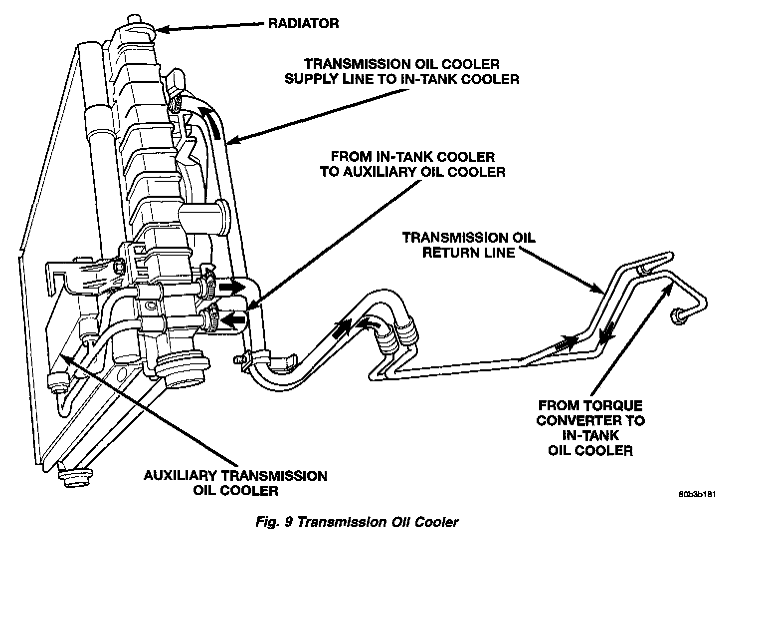 Steel tubes and rubber lines supply the oil from the transmission to the internal oil cooler and return the oil to the transmission from the auxiliary external oil cooler.