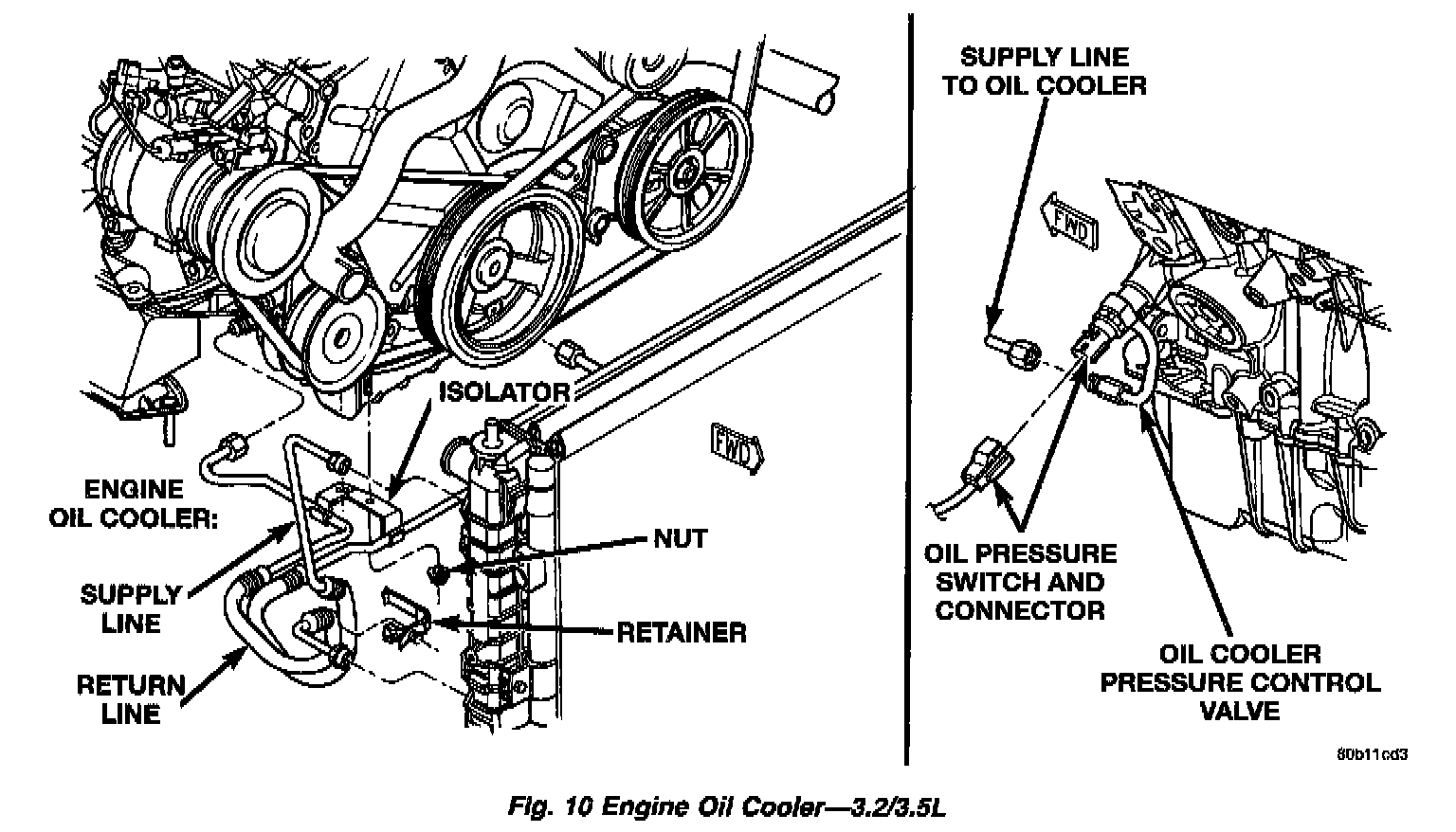 The 3.2/3.5L engine uses an engine oil cooler that is mounted inside the right radiator tank. An oil cooler pressure control valve is used to control flow to the cooler. Engine oil travels from the control valve through the supply line and into the cooler. The engine oil exits the cooler through the oil return line and is returned to the engine oil pan.