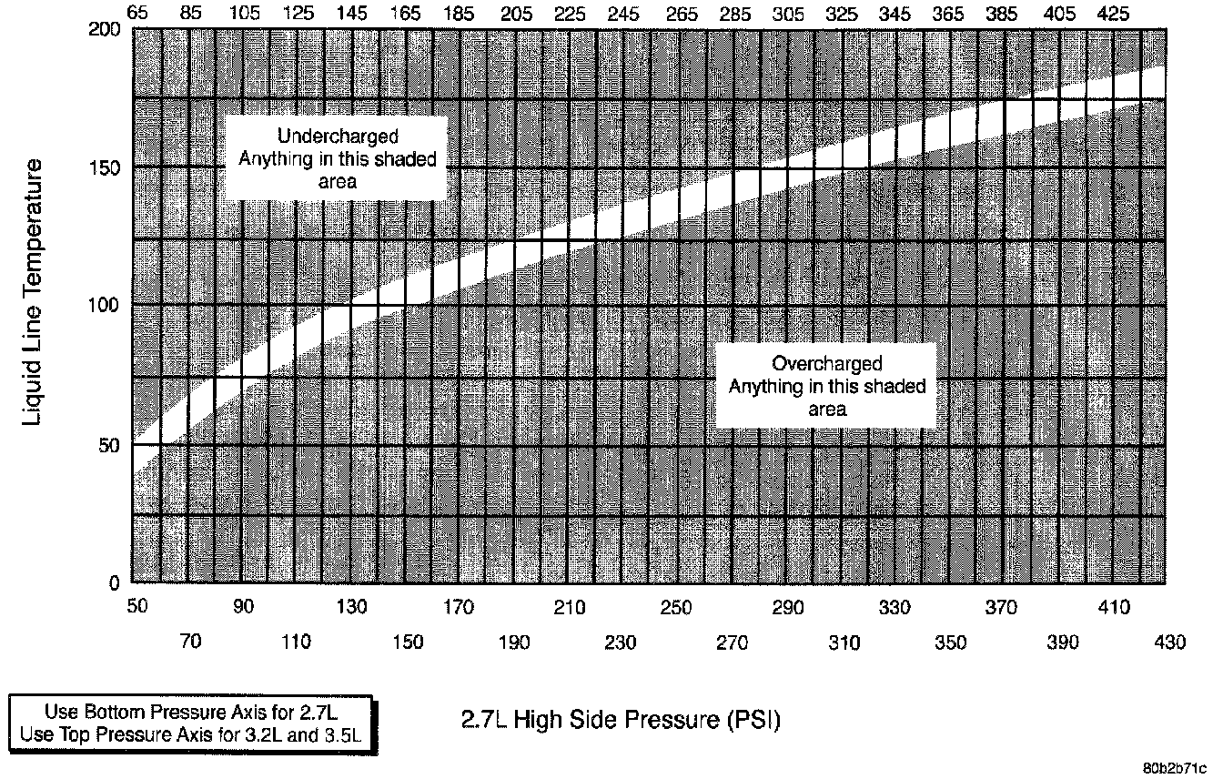 6. Observe Discharge pressure and Liquid line temperature. Using the Charge Determination Graph determine where the system is currently operating. If the system is in the undercharged region, ADD 0.057 Kg. (2 oz.) to the system and recheck readings. If the system is in the overcharged region, RECLAIM 0.057 Kg. (2 oz.) from the system and recheck readings. Continue this process until the system readings are in the proper charge area on the Charge Determination Chart.