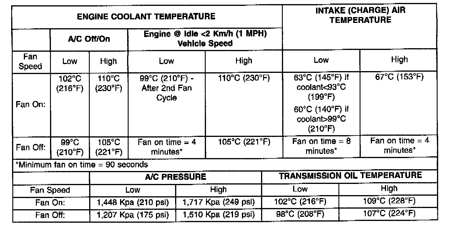 RADIATOR FAN CONTROLCooling fan control can be accomplished five ways. A pressure transducer on the air conditioning compressor discharge line sends a signal to the Powertrain Control Module (PCM) which will activate both fans if necessary. In addition to this control, the fans are turned on based on coolant temperature sensor, intake air temperature sensor, output speed sensor, and transmission oil temperature sensor output to the PCM. The PCM switches the fans on through the fan relays.