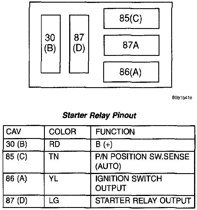3. The relay normally open terminal (87) is connected to the common feed terminal (30) in the energized position. This terminal supplies battery voltage to the starter solenoid field coils. There should be continuity between the cavity for relay terminal 87 and the starter solenoid terminal at all times. If OK, go to Step 4. If not OK, repair the open circuit to the starter solenoid as required.