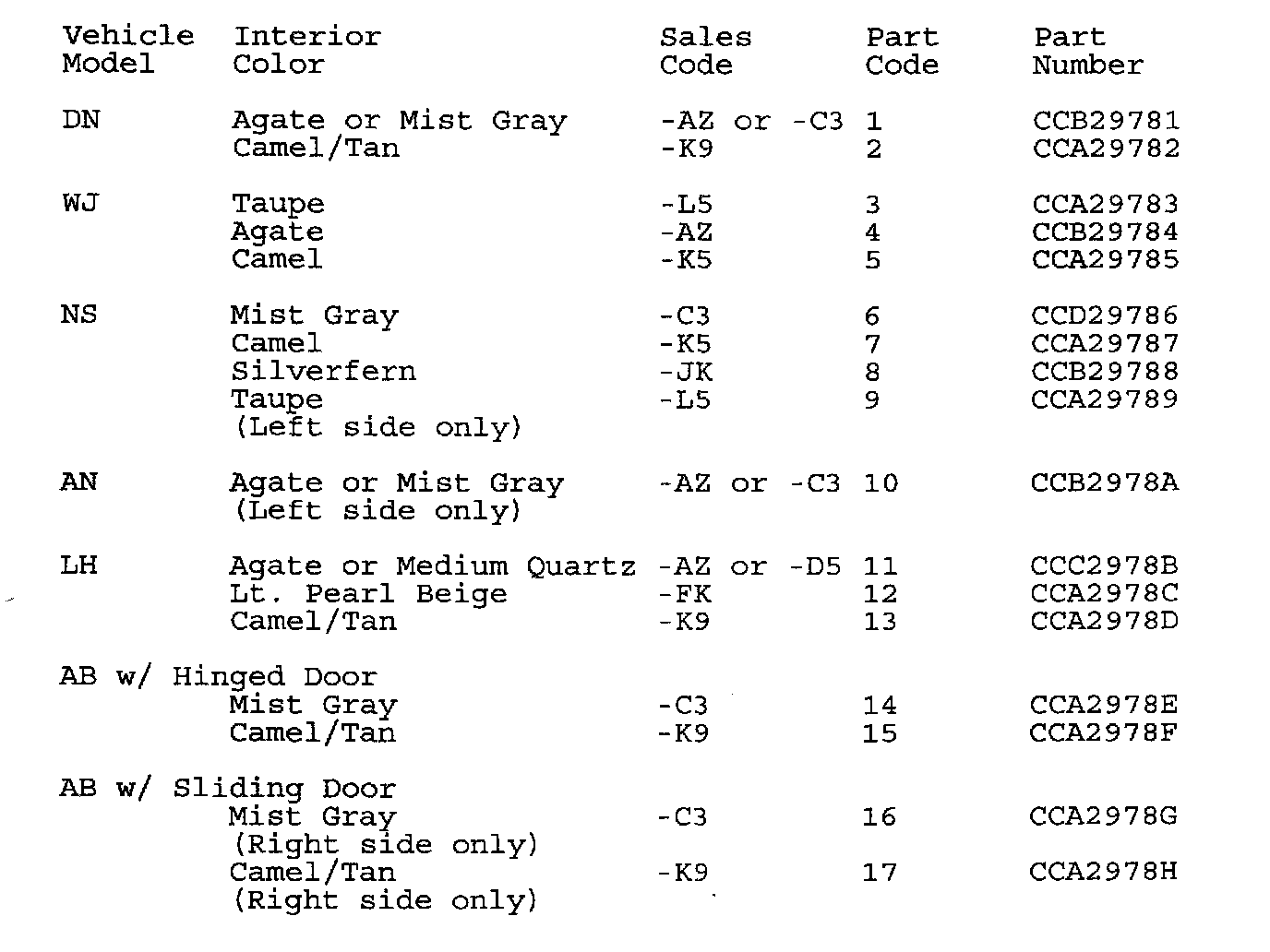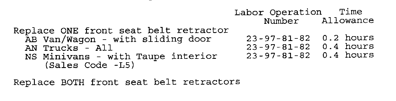 No parts will be distributed initially for this recall. Dealers should determine which Seat Belt Retractor package is required for each vehicle at the time appointments are scheduled to assure that the correct parts are available when the customer arrives. Each package contains a right and a left front seat belt retractor (except as noted) . The retractor package for the vehicle to be serviced may be determined by: