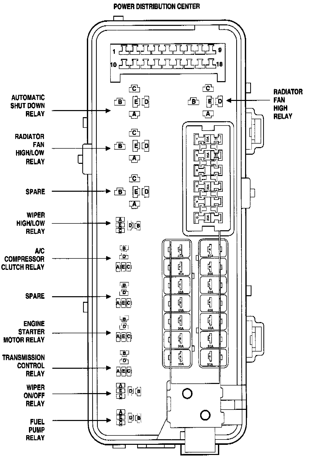 The ASD relay and fuel pump relay are located in the Power Distribution Center