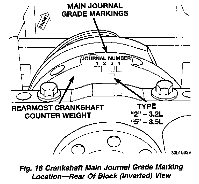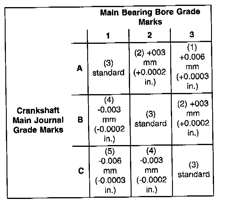 The grade marks for the crankshaft are located on the rearmost crankshaft counter weight as shown in illustration. The crankshaft journal grade marks (A, B. or C) are read left to right, corresponding with journal number 1, 2, 3, 4.