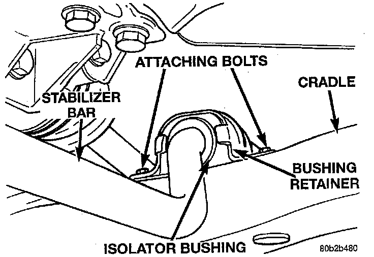 2. Remove the 2 bolts attaching each of the 2 stabilizer bushing retainers and bushings to the cradle assembly.