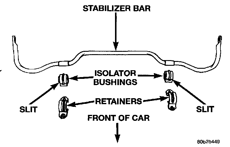 4. Inspect for broken or distorted retainers and bushings. If bushing replacement is required, the bushing can be removed by opening the slit in the bushing and removing the bushing from around stabilizer bar. The stabilizer bar to cradle assembly bushings must be positioned on the stabilizer bar so the slit in the bushing is positioned toward front of vehicle.