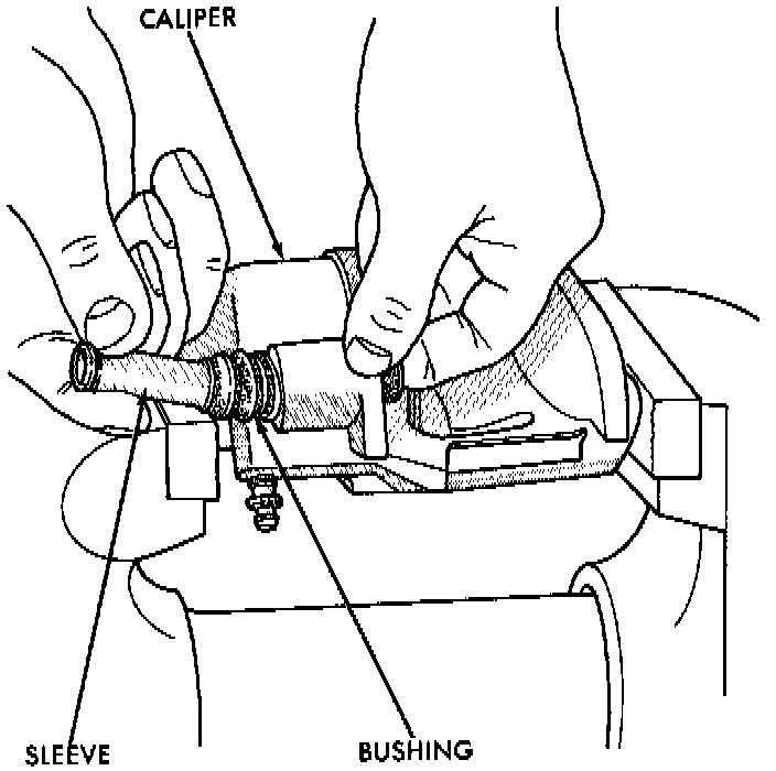 1. With one hand, push the guide pin bushing sleeve towards the back of the caliper, and at the same time, pull the sleeve out the back of the caliper and bushing.
