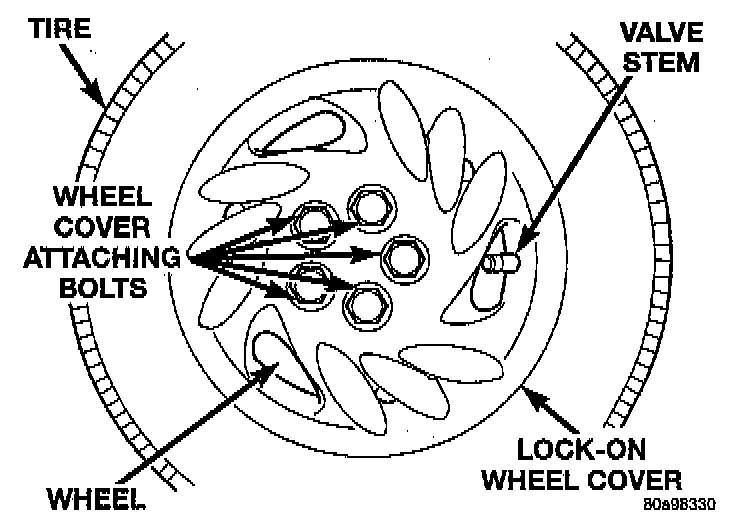 NOTE: When tightening the wheel cover retaining nuts it is recommended that a hand wrench be used and not an impact wrench. Use of an impact wrench could result in damage to the lock-on wheel cover retaining nuts.