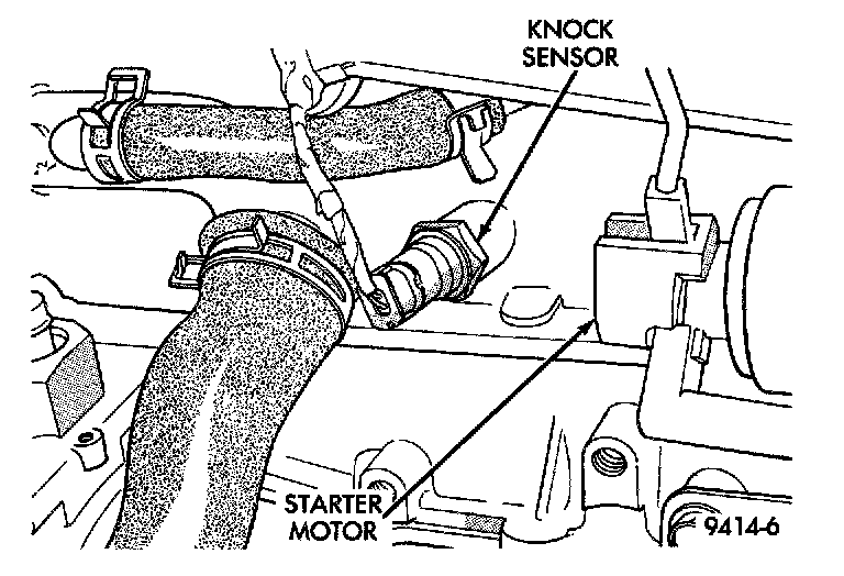 The knock sensor threads into the side of the cylinder block in front of the starter.