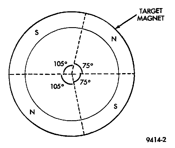 The target magnet has four different poles arranged in an asymmetrical pattern. As the target magnet rotates, the camshaft position sensor senses the change in polarity. The sensor input switches from high (5 volts) to low (0.30 volts) as the target magnet rotates. When the north pole of the target magnet passes under the sensor, the output switches high. The sensor output switches low when the south pole of the target magnet passes underneath.