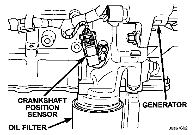 The crankshaft position sensor mounts to the engine block behind the generator, just above the oil filter.