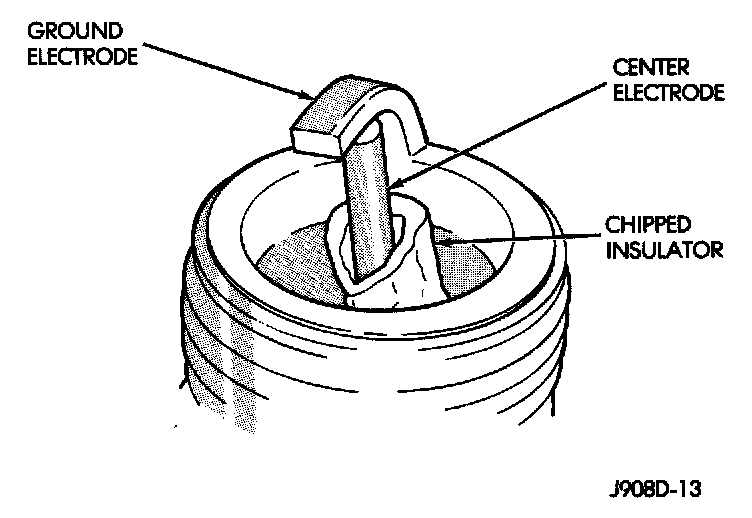 A chipped electrode insulator usually results from bending the center electrode while adjusting the spark plug electrode gap. Under certain conditions, severe detonation also can separate the insulator from the center electrode. Spark plugs with chipped electrode insulators must be replaced.