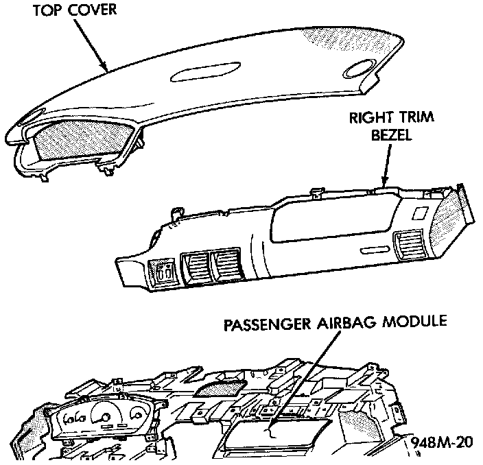 5. Remove the four trim screws which attach the Passenger Airbag Module to the top instrument panel.