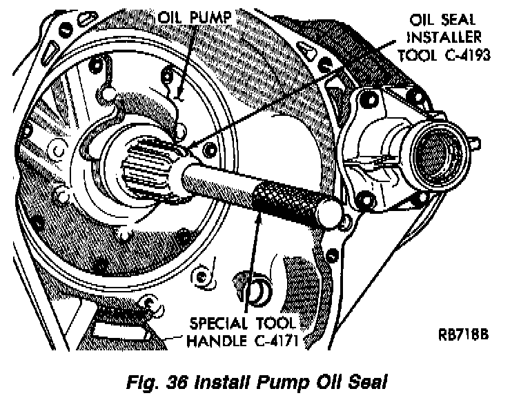 1. To install a new seal, place seal in opening of the pump housing (lip side facing inward). Using Tool C-4193 and Handle Tool C-4171, drive new seal into housing until tool bottoms (Fig. 36).