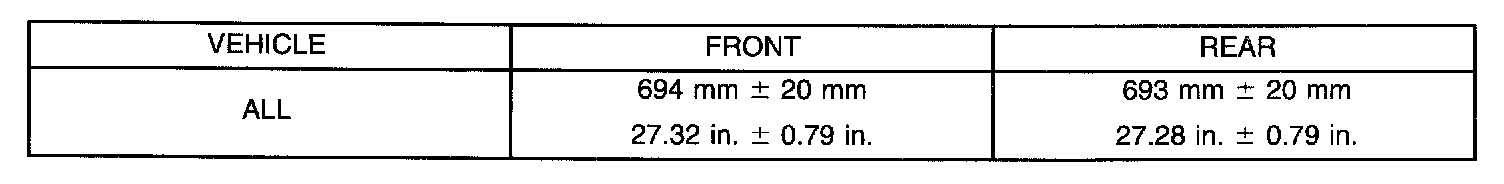 Vehicle height is to be checked with the vehicle on a flat, level surface, preferably a vehicle alignment rack. The tires are to be inflated to the recommended pressure. All tires are to be the same size as standard equipment. Vehicle height is checked with the fuel tank full of fuel, and no passenger or luggage compartment load.