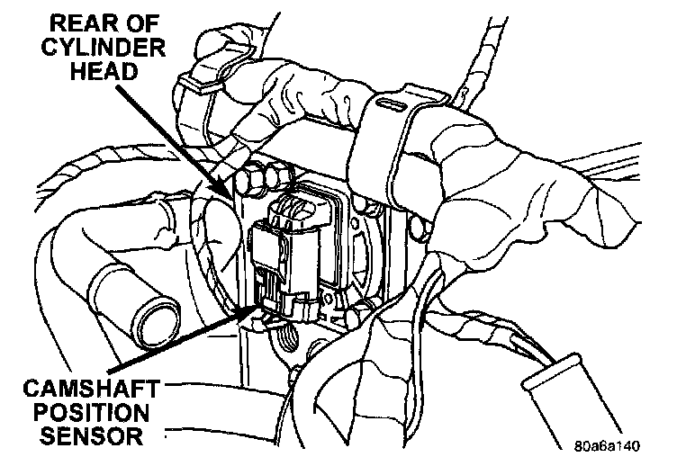 The camshaft position sensor attaches to the rear of the cylinder head.