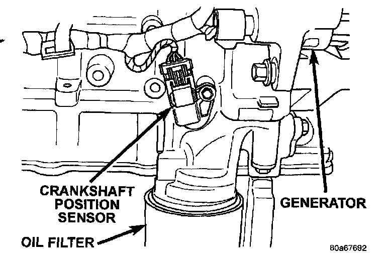 The 2.0/2.4L crankshaft position sensor mounts to the engine block behind the generator, just above the oil filter.