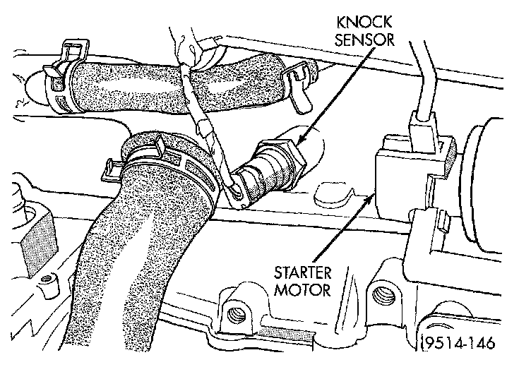 The knock sensor threads into the side of the cylinder block in front of the starter.