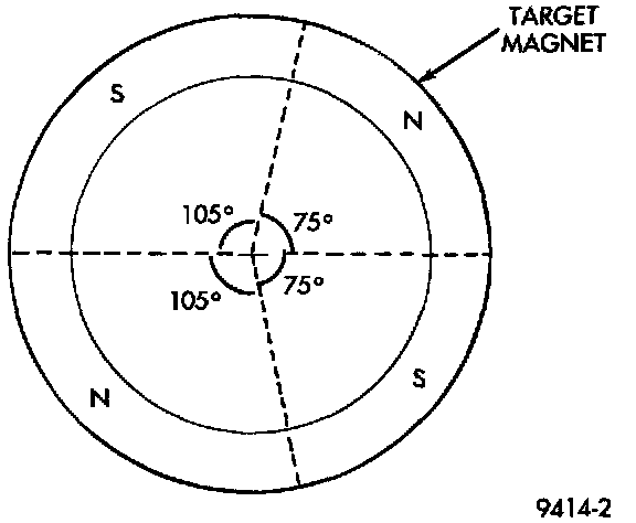 A target magnet attaches to the rear of the cam- shaft and indexes to the correct position. The target magnet has four different poles arranged in an asymmetrical pattern. As the target magnet rotates, the camshaft position sensor senses the change in polarity.