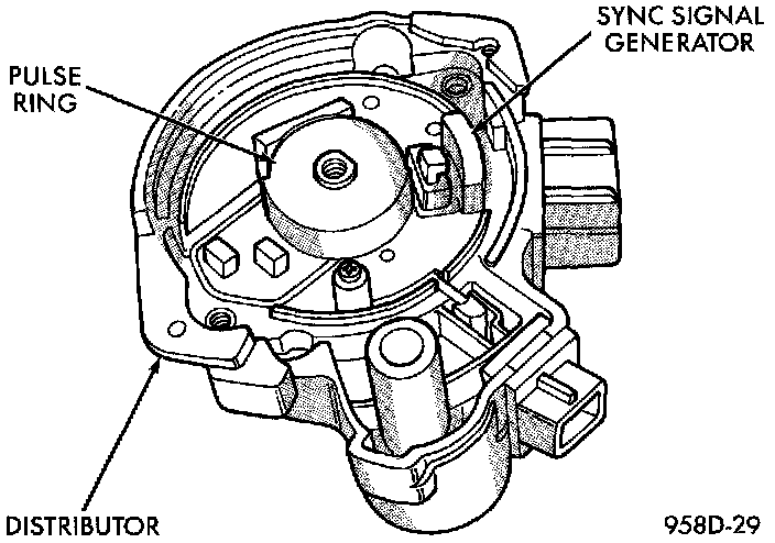 The camshaft position sensor contains a hall effect device called a sync signal generator. This sync signal generator detects a rotating pulse ring (shutter) on the distributor shaft. The pulse ring rotates 180 through the sync signal generator. Its signal is used in conjunction with the crankshaft position sensor to differentiate between fuel injection and spark events. It is also used to synchronize the fuel injectors with their respective cylinders.