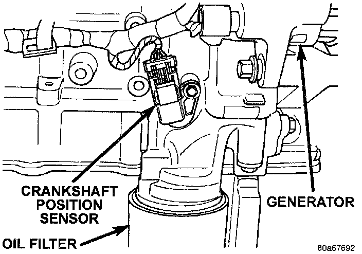 The crankshaft position sensor mounts to the engine block behind the generator, just above the oil filter.