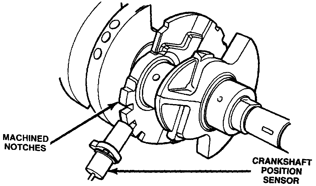 The notches generate pulses from high to low in the crankshaft position sensor Output voltage. When a metal portion of the counterweight aligns with the crankshaft position sensor, the sensor Output voltage goes low (less than 0.5 volts). When a notch aligns with the sensor, voltage goes high (5.0 volts). As a group of notches pass under the sensor; the output voltage switches from low (metal) to high (notch) then back to low.