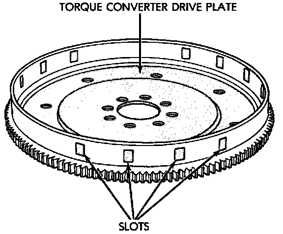 The crankshaft position sensor detects slots cut into the transmission driveplate extension. There are 3 sets of slots. Each set contains 4 slots, for a total of 12 slots. Basic timing is set by the position of the last slot in each group. Once the Powertrain Control Module (PCM) senses the last slot, it determines crankshaft position (which piston will next be at TDC) from the camshaft position sensor input. The 4 pulses generated by the crankshaft position sensor represent the 69°, 49°, 29°, and 9° BTDC marks. It may take the PCM one engine revolution to determine crankshaft position.