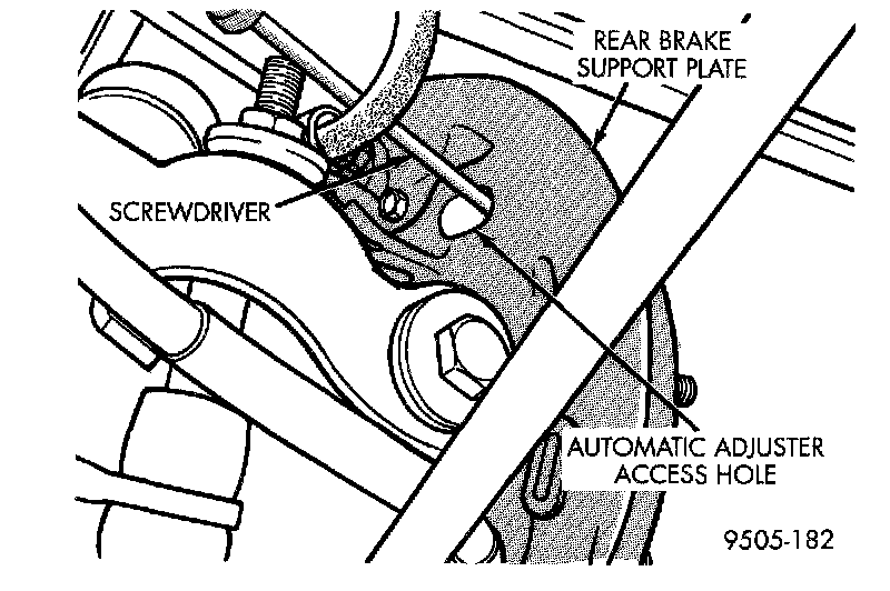 Place the vehicle on a frame contact hoist with a helper in the driver's seat to apply the brakes. Raise the vehicle. Remove the adjuster access plug from the rear brake support plate automatic adjuster access hole. This will allow access to the adjuster quadrant on the automatic adjuster mechanism. Then, to eliminate the possibility of maximum adjustment, insert a small screwdriver through the access hole in the support plate.