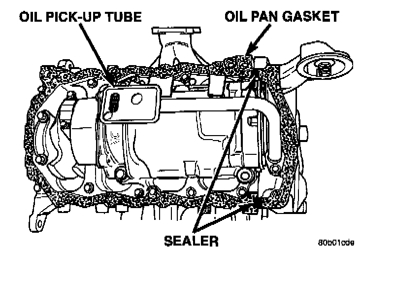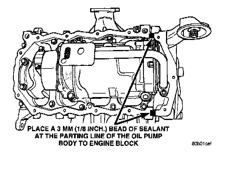 1. Apply Mopar(R) Silicone Rubber Adhesive Sealant or equivalent at the oil pump to engine block parting line.