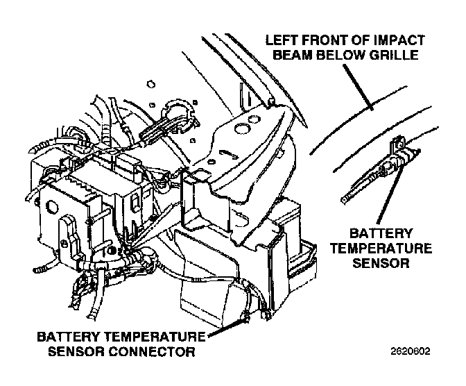 Left Front Of Impact Beam Below Grille, Battery Temperature Sensor, Battery Temperature Sensor Connector: