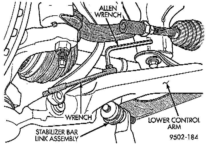 10. Remove nut attaching stabilizer bar link to lower control arm. When are moving nut, hold stud of stabilizer bar link from turning by inserting an allen wrench in the end of the stud.