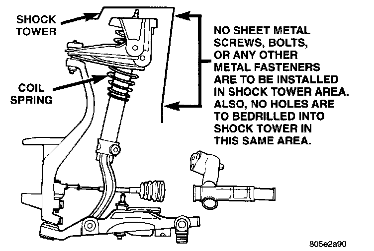 - At no time when servicing a vehicle, can a sheet metal screw, bolt or other metal fastener be installed in the shock tower to take the place of an original plastic clip. Also, NO holes can be drilled into the front shock tower in the area shown, for the installation of any metal fasteners into the shock tower. Because of the minimum clearance in this area installation of metal fasteners could damage the coil spring coating and lead to a corrosion failure of the spring.