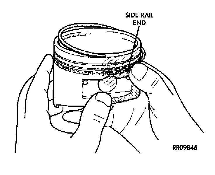 2. Install the side rails (upper rail first, then lower rail) by placing one end between the piston ring groove and the expander. Hold end firmly and press down the portion to be installed until side rail is in position. Do Not use a piston ring expander.