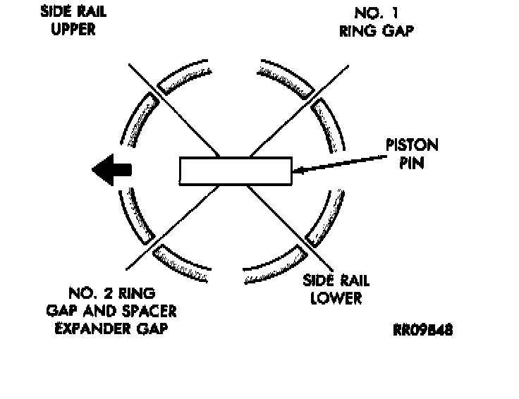5. Position oil ring expander gap at least 45° from the side rail gaps but not on the piston pin center or on the thrust direction.