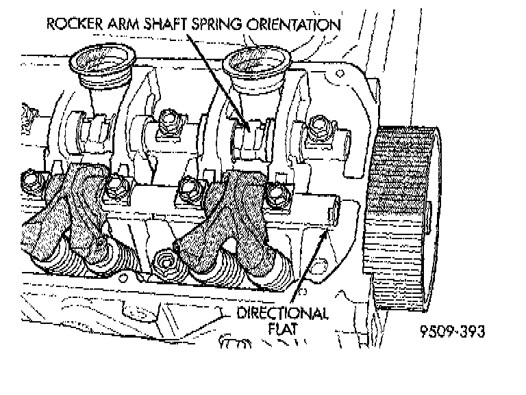 1. Install rocker arm and shafts with the FLAT on the shafts facing the timing belt side of the right cylinder head. For the left cylinder head, install rocker arm and shafts with the FLAT on the shafts facing the transmission side of the engine.