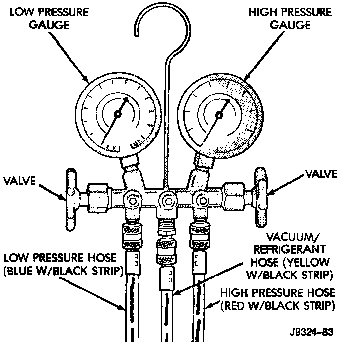A manifold gauge set must also be used in conjunction with the charging and/or recovery/recycling device. Only use gauges that have not been used for R-12. The service hoses on the gauge set should have manual (turn wheel) or automatic back flow valves at the service port connector ends. This will prevent refrigerant R-134a from being released into the atmosphere.