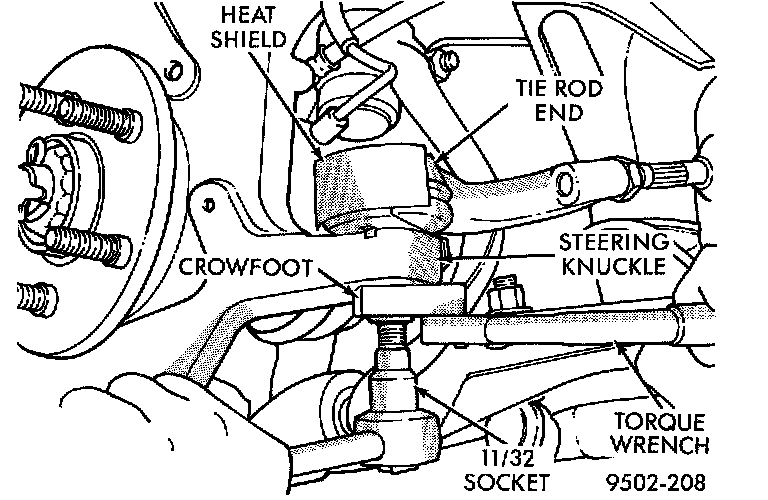 5. Install tie rod end into the steering knuckle. Start tie rod end to steering knuckle attaching nut onto stud of tie rod end. While holding the stud of the tie rod end stationary, tighten tie rod end to steering knuckle attaching nut. Then using a crowfoot and 11/32 socket tighten the attaching nut to a torque of 61 Nm (45 ft. lbs.).