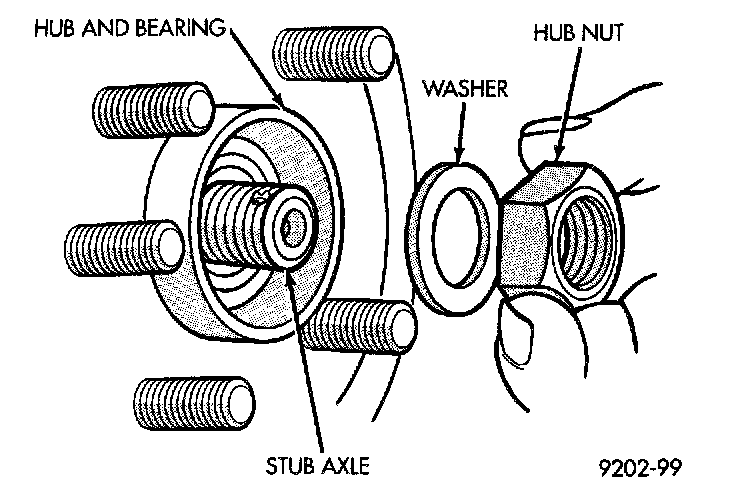 9. Clean all foreign matter from the threads of the outer C/V joint stub axle. Install the washer and hub nut onto the stub axle and tighten nut.